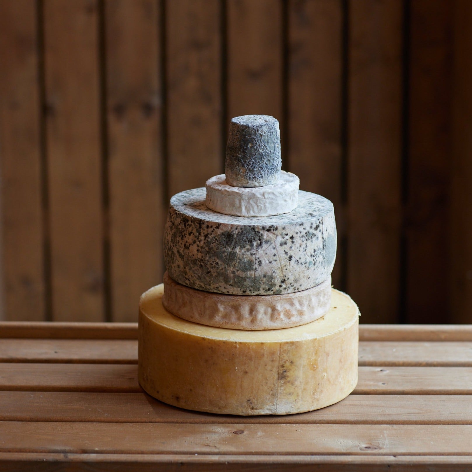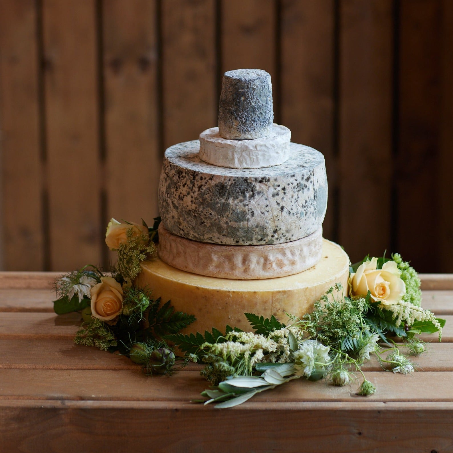 A five-tier celebration cheese cake featuring some of the best organic cheeses from around the United Kingdom and Ireland. Serving approximately 70 to 90 people, this cake includes from base to top: