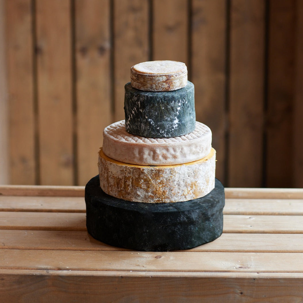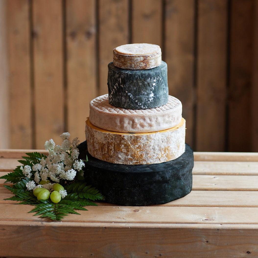 A five-tier celebration cheese cake featuring some of the best organic cheeses from around the United Kingdom and Ireland. Serving approximately 80 to 100 people, this cake includes from base to top: