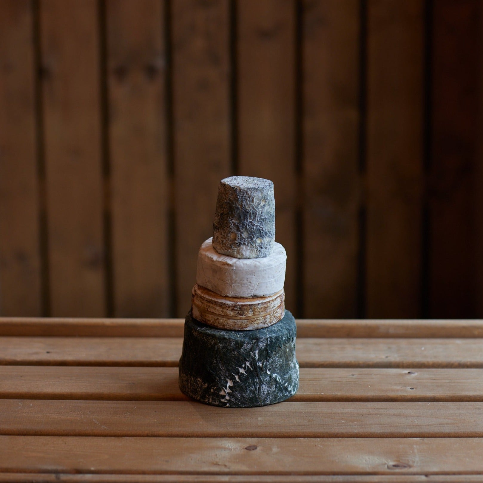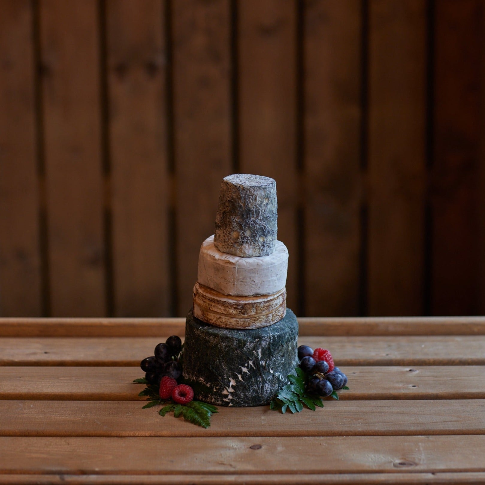 A four-tier celebration cheese cake featuring some of the best organic cheeses from around the United Kingdom and Ireland. Serving approximately 10 to 20 people, this cake includes from base to top: