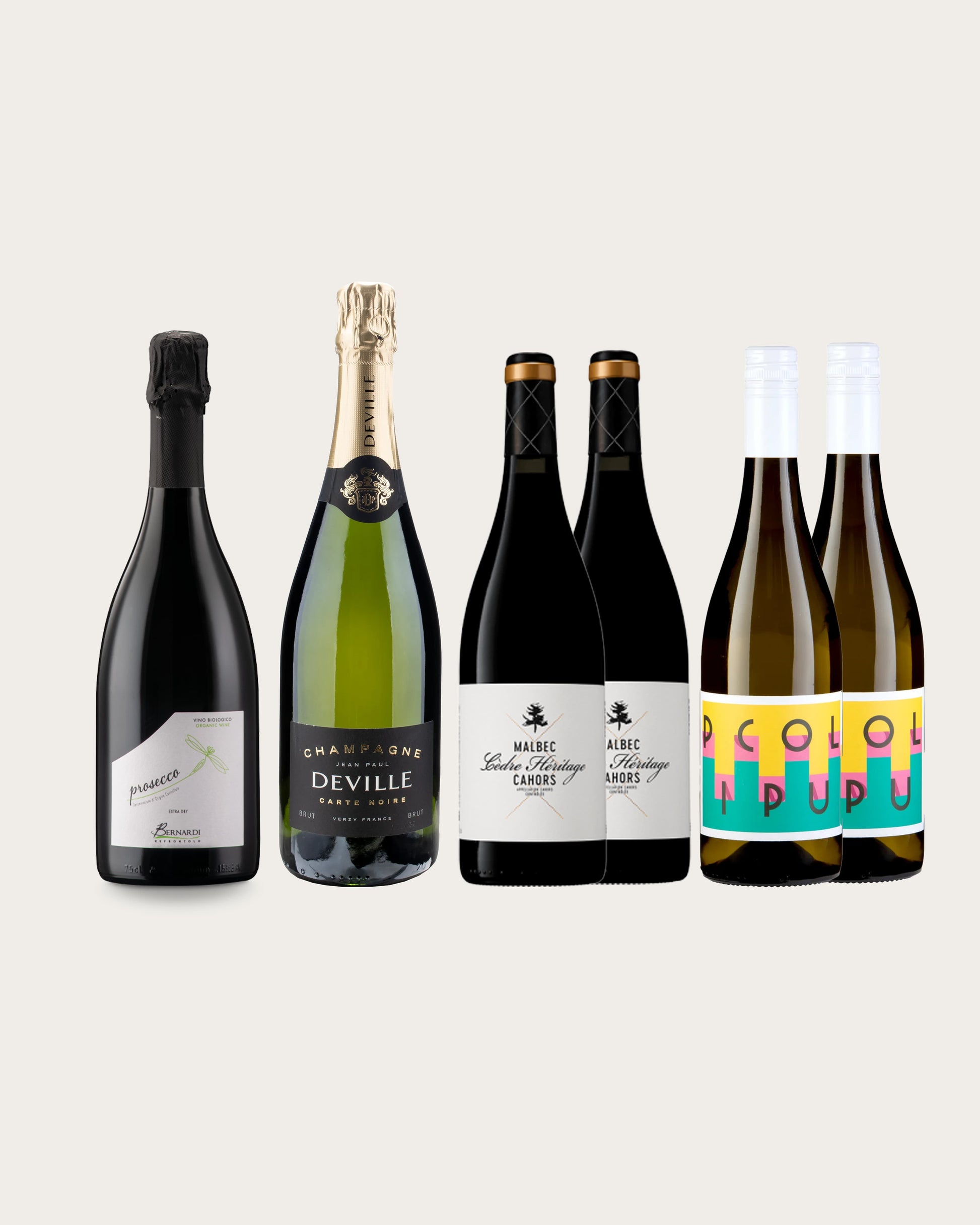 A selection of 6 wines chosen by our Deli that includes a champagne, a prosecco, red wine and white wine.