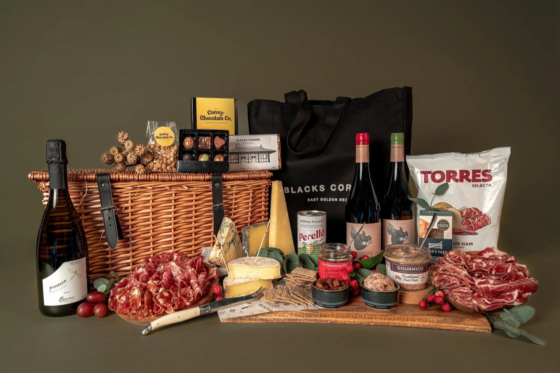 Luxuries from Blacks Corner including the best of British Cheese, Charcuterie perfectly paired with our favourite red, white and sparkling wines, a basket to keep our pantry selection in and an exclusive tote bag made especially.