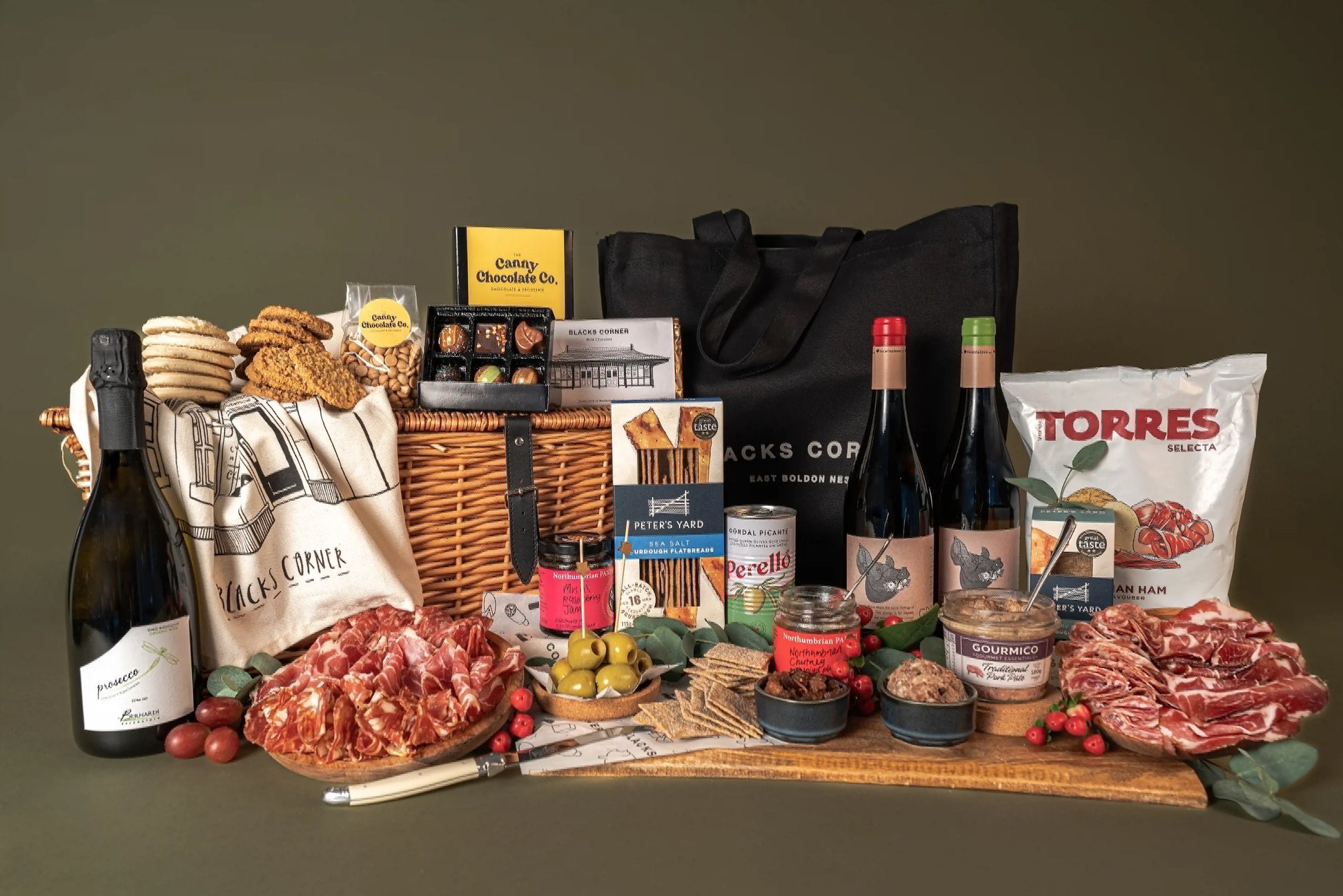 Luxuries from Blacks Corner including the best of British Cheese, Charcuterie perfectly paired with our favourite red, white and sparkling wines, a basket to keep our pantry selection in and an exclusive tote bag made especially.
